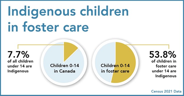 In Canada, 53.8% of children in foster care are Indigenous, but account for only 7.7% of the child population according to Census 2021.