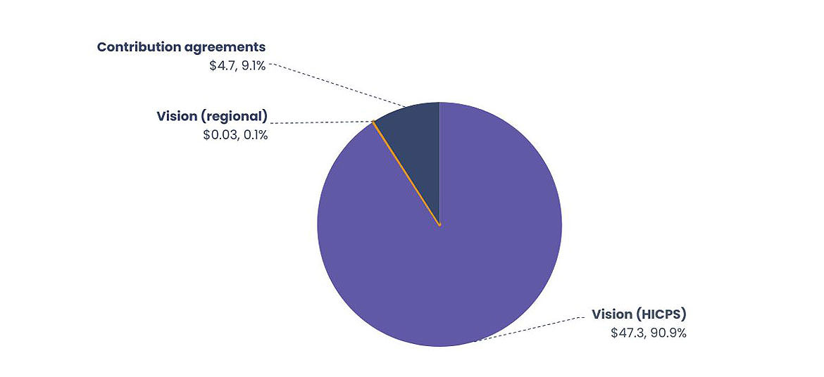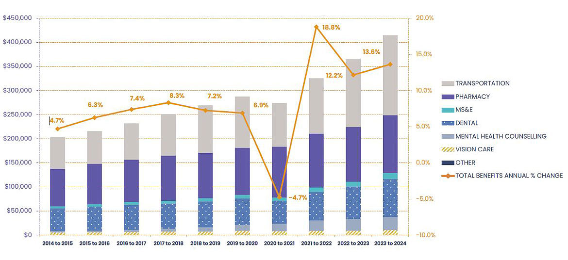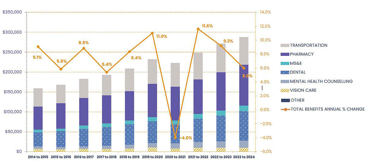 Starting in 2023 to 2024, expenditures relating to administration of the HICPS contract are being reporting only at the program level. As such, historical values reported for individual benefits will not match those reported in previous editions of the NIHB Annual Report.