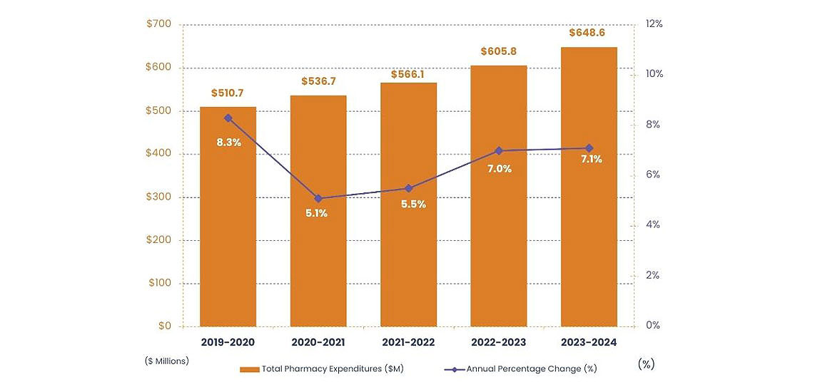 Starting in 2020 to 2021, expenditures for the NIHB MS&E benefit are being reported separately from NIHB pharmacy benefit expenditures. As such, historical values reported for NIHB pharmacy will not match those reported in previous editions as those values included MS&E.